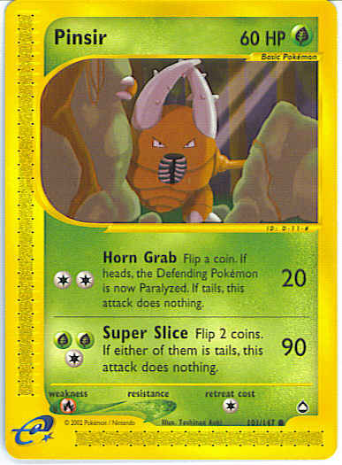| Type | Grass | | Pokemon serie | Aquapolis | | Stadie | Basic | | HP | 60 | | Sjældenhed | Common | | Tilbagetrækning | 1 | | Svaghed | R | | Kortnummer | 101 | | Evne | [CC] Horn Grab (20) Flip a coin. If heads, the Defending Pokemon is now Poisoned. If tails, this attack does nothing (not even damage). [CGG] Super Slice (90) Flip 2 coins. If 1 or both of them are tails, this attack does nothing.