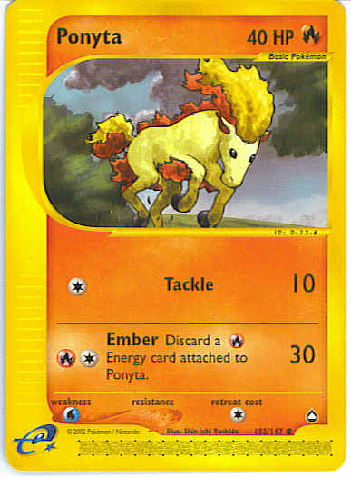 | Type | Fire | | Pokemon serie | Aquapolis | | Stadie | Basic | | HP | 40 | | Sjældenhed | Common | | Tilbagetrækning | 1 | | Svaghed | W | | Kortnummer | 102 | | Evne | [C] Tackle (10) [CR] Ember (30) Discard 1 R Energy card attached to Ponyta.