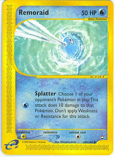 | Type | Water | | Pokemon serie | Aquapolis | | Stadie | Basic | | HP | 50 | | Sjældenhed | Common | | Tilbagetrækning | 1 | | Svaghed | L | | Kortnummer | 105 | | Evne | [W] Splatter - Choose 1 of your opponent's Pokemon. This attack does 10 damage to that Pokemon. Don't apply Weakness and Resistance.