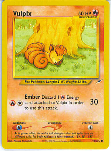 | Type | Fire | | Pokemon serie | Neo Destiny | | Stadie | Basic | | HP | 50 | | Sjældenhed | Common | | Tilbagetrækning | 1 | | Svaghed | W | | Kortnummer | 91 | | Evne |