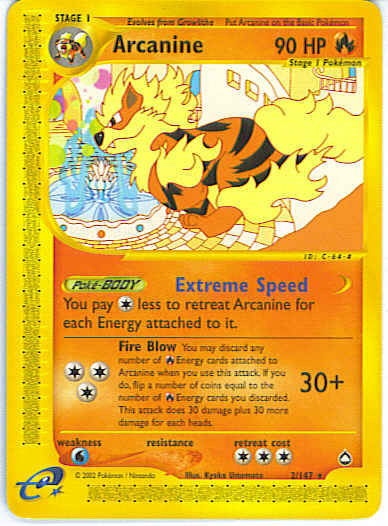 Evne2[CCC] Fire Blow (30+) You may discard any number of R Energy cards attached to Arcanine. If you do, flip a number of coins equal to the number of R Energy cards you discarded in this way. This attack does 30 damage plus 30 more damage for each heads.