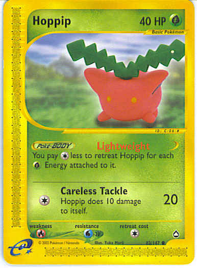 | Type | Grass | | Pokemon serie | Aquapolis | | Stadie | Basic | | HP | 40 | | Sjældenhed | Common | | Tilbagetrækning | 1 | | Modstand | W | | Svaghed | R | | Kortnummer | 83 | | Evne | [C] Careless Tackle (20) Hoppip does 10 damage to itself.