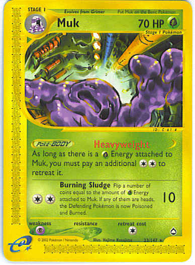 | Type | Grass | | Pokemon serie | Aquapolis | | Stadie | Stage 1 | | HP | 70 | | Sjældenhed | Rare | | Tilbagetrækning | 1 | | Svaghed | P | | Kortnummer | 23 | | Evne | [CC] Burning Sludge (10) Count the number of G Energy attached to Muk. Flip that many coins. If you get 1 or more heads, the Defending Pokemon is now Burned and Poisoned.