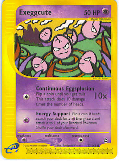 | Type | Psychic | | Pokemon serie | Aquapolis | | Stadie | Basic | | HP | 50 | | Sjældenhed | Common | | Tilbagetrækning | 1 | | Svaghed | P | | Kortnummer | 77 | | Evne | [C] Continuous Eggsplosion (10x) Flip a coin until you get tails. This attack does 10 damage times the number of heads. [P] Energy Support - If you have any Benched Pokemon, flip a coin. If heads, search your deck for a P Energy card and attach it to 1 of them. Shuffle your deck afterward.