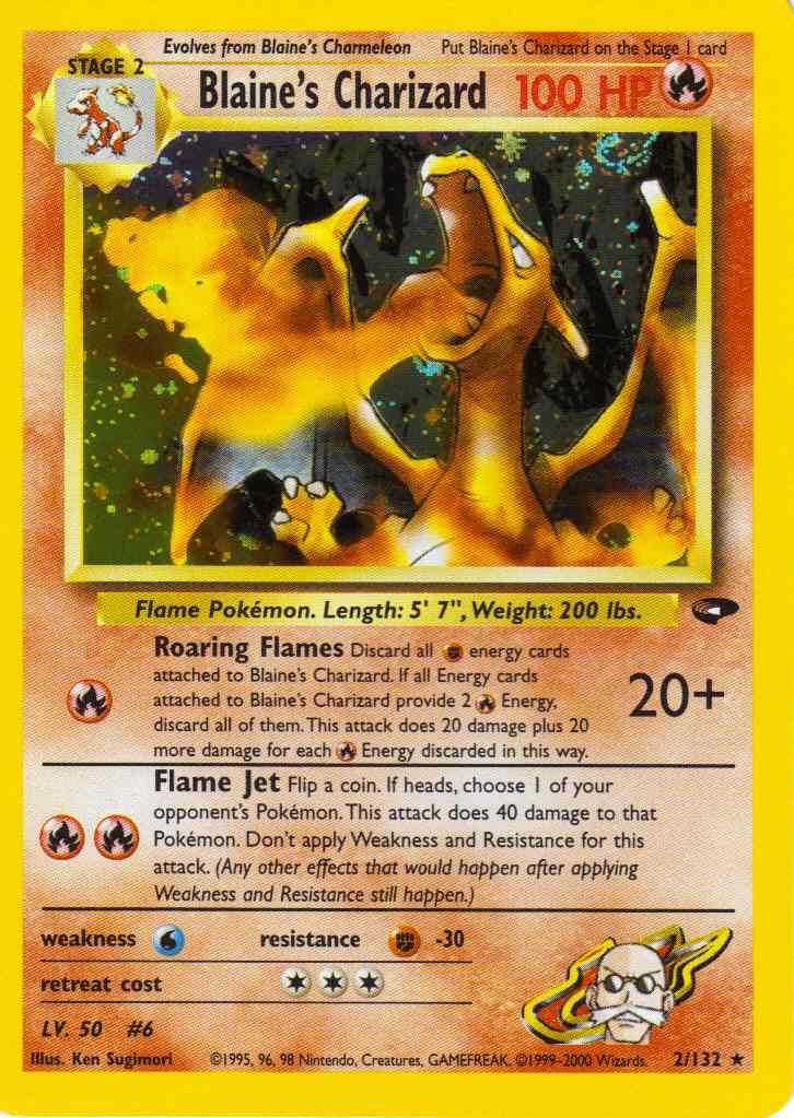 Evne2 [R] Roaring Flames (20+) Discard all R Energy cards attached to Blaine's Charizard except 1. If all Energy cards attached to Blaine's Charizard provide 2 R Energy, discard all of them. This attack does 20 damage plus 20 more damage for each R Energy discard in this way.