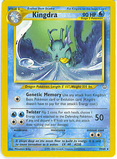 Evne2 [C] Genetic Memory - Use any attack from Kingdra's Basic Pokemon card or Evolution card. (Kingdra doesn't have to pay for that attack's Energy cost.)