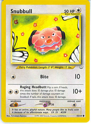 [CC] Raging Headbutt (10+) Flip a coin. If heads, this attack does 10 damage plus 10 damage times the number of damage counters on Snubbull. If tails, this attack does 10 damage.