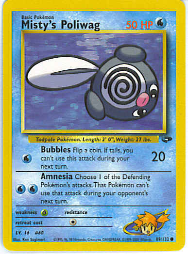 | Type | Water | | Pokemon serie | Gym Challenge | | Stadie | Basic | | HP | 50 | | Sjældenhed | Common | | Tilbagetrækning | 1 | | Svaghed | G | | Kortnummer | 89 | | Evne |