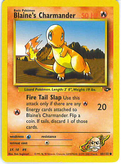 Evne [R] Fire Tail Slap (20) Use this attack only if there are any R Energy cards attached to Blaine's Charmander. Flip a coin. If tails, discard 1 of those cards.