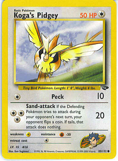 | Type | Colorless | | Pokemon serie | Gym Challenge | | Stadie | Basic | | HP | 50 | | Sjældenhed | Common | | Tilbagetrækning | 1 | | Modstand | F | | Svaghed | L | | Kortnummer | 80 | | Evne |