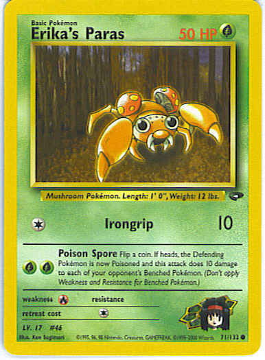 | Type | Grass | | Pokemon serie | Gym Challenge | | Stadie | Basic | | HP | 50 | | Sjældenhed | Common | | Tilbagetrækning | 1 | | Svaghed | R | | Kortnummer | 71 | | Evne |