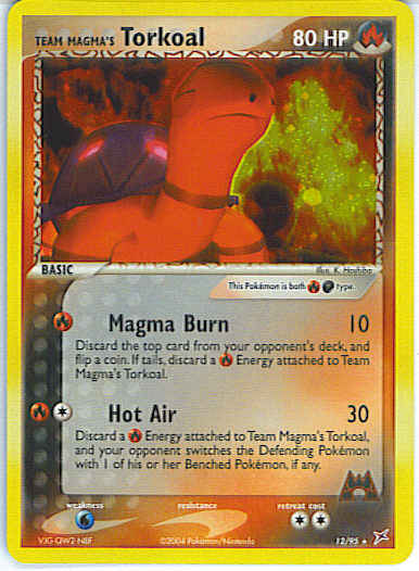 | Type | Darkness Fire | | Pokemon serie | Team Aqua-Team Magma | | Stadie | Basic | | HP | 80 | | Sjældenhed | Rare | | Tilbagetrækning | 2 | | Svaghed | W | | Kortnummer | 12 | | Evne | [R] Magma Burn (10) Discard the top card from your opponent's deck, and flip a coin. If tails, discard a R Energy attached to Team Magma's Torkoal. [CR] Hot Air (30) Discard a R Energy attached to Team Magma's Torkoal, and your opponent switches the Defending Pokemon with 1 of his or her Benched Pokemon, if any.