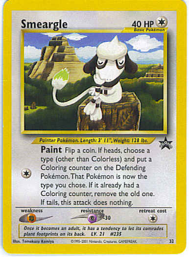 Evne [C] Paint - Flip a coin. If heads, choose a type (other than colorless) and put a Coloring counter on the Defending Pokemon. That Pokemon is now the type you choose. If it already had a Coloring counter, remove the old one. If tails, this attack does nothing.