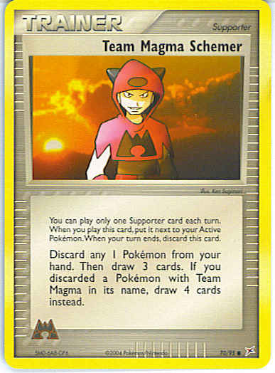 Evne2Discard any 1 Pokemon from your hand. Then draw 3 cards. If you discarded a Pokemon with Team Magma in its name, draw 4 cards instead.
