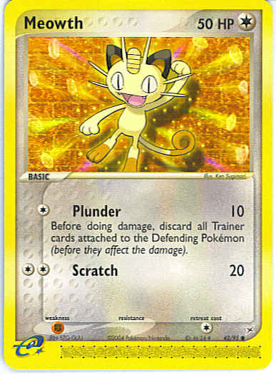 | Type | Colorless | | Pokemon serie | Team Aqua-Team Magma | | Stadie | Basic | | HP | 50 | | Sjældenhed | Common | | Tilbagetrækning | 1 | | Svaghed | F | | Kortnummer | 42 | | Evne | [C] Plunder (10) Before doing damage, discard all Trainer cards attached to the Defending Pokemon (before they affect the damage). [CC] Scratch (20)