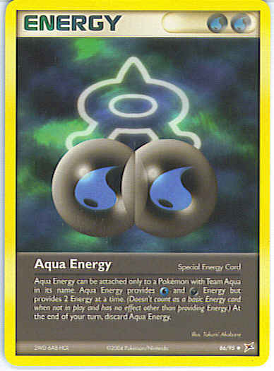 Evne2Aqua Energy can be attached only to a Pokemon with Team Aqua in its name. Aqua Energy provides W and D Energy but provides 2 Energy at a time. (Doesn't count as a basic Energy card when not in play and has no effect other than providing Energy.) At the end of your turn, discard Aqua Energy.