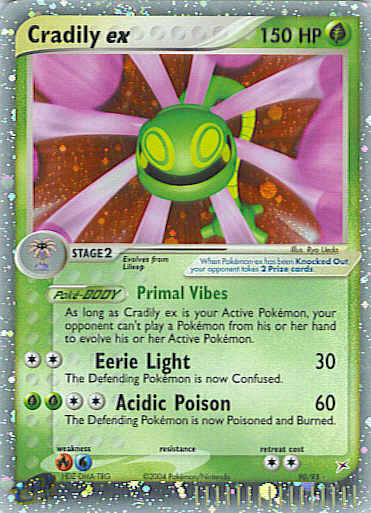 | Type | Grass | | Pokemon serie | Team Aqua-Team Magma | | Stadie | Stage 2 | | HP | 150 | | Sjældenhed | Ultra-Rare | | Tilbagetrækning | 2 | | Svaghed | RW | | Kortnummer | 90 | | Evne | [CC] Eerie Light (30) The Defending Pokemon is now Confused. [CCGG] Acidic Poison (60) The Defending Pokemon is now Poisoned and Burned.