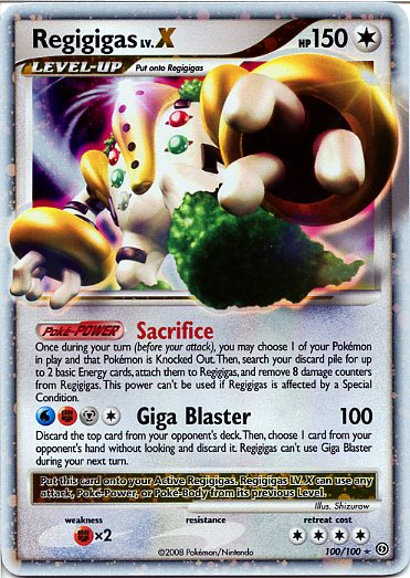 [CFMW] Giga Blaster (100) Discard the top card from your opponent's deck. Then choose 1 card from your opponent's hand without looking and discard it. Regigigas can't use Giga Blaster during your next turn.