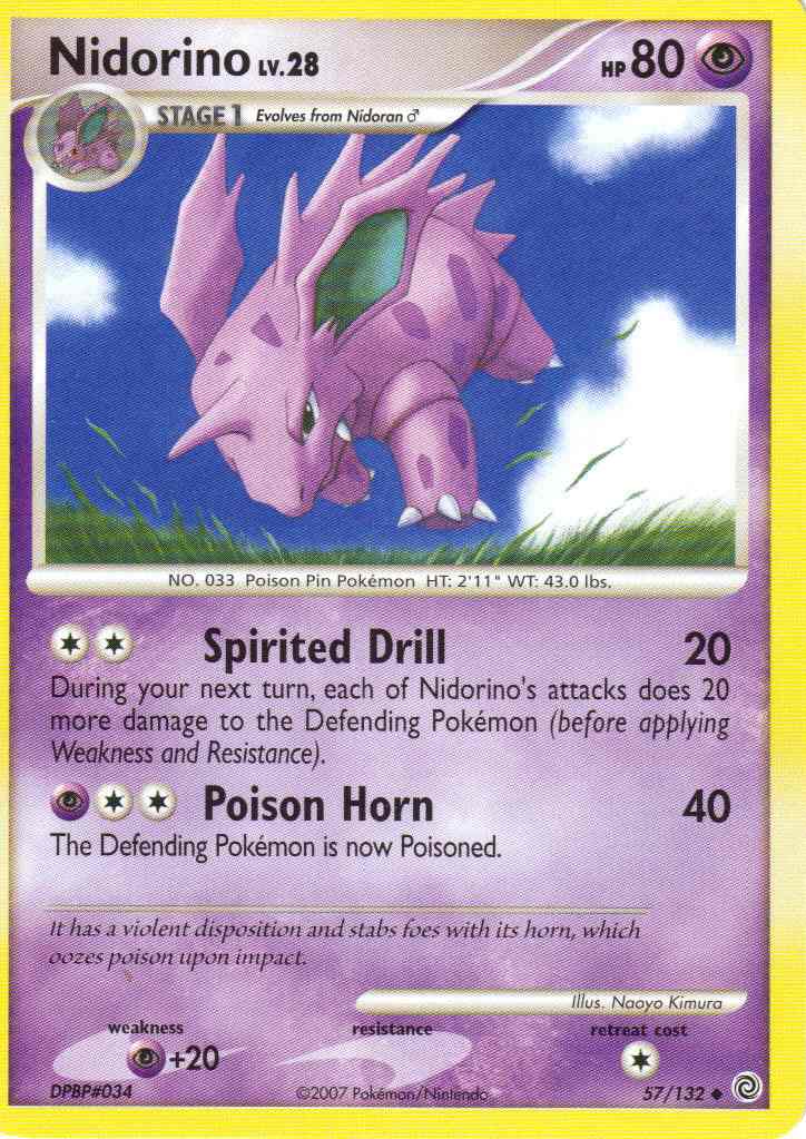 Evne [CC] Spirited Drill (20) During your next turn, each of Nidorino's attacks does 20 more damage to the Defending Pokemon (before applying Weakness and Resistance).
