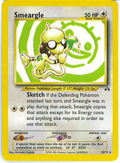 Evne [CC] Sketch - If the Defending Pokemon attacked last turn, and Smeargle was in play during that attack, Smeargle copies that attack except for its Energy costs and anything else required in order to use that attack.