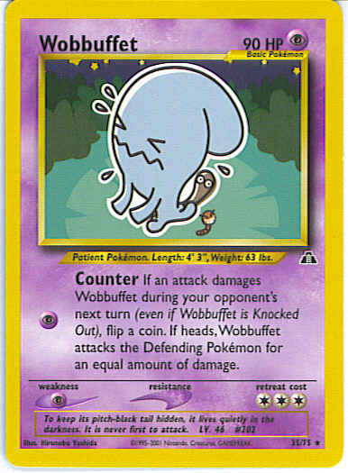 Evne [P] Counter - If an attack damages Wobbuffet during your opponent's next turn (even if Wobbuffet is knocked out), flip a coin. If heads, Wobbuffet attacks the Defending Pokemon for an equal amount of damage.