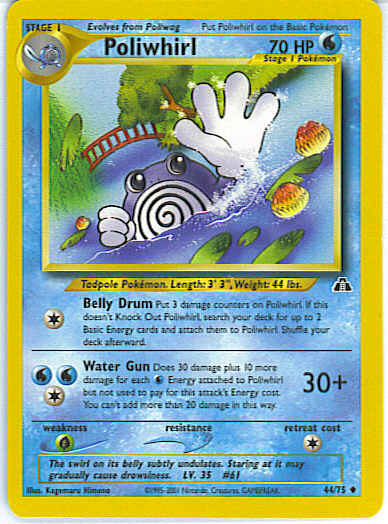 Evne [C] Belly Drum - Put 3 damage counters on Poliwhirl. If this doesn't knock out Poliwhirl, search your deck for up to 2 Basic Energy cards and attach them to Poliwhirl. Shuffle your deck afterward.