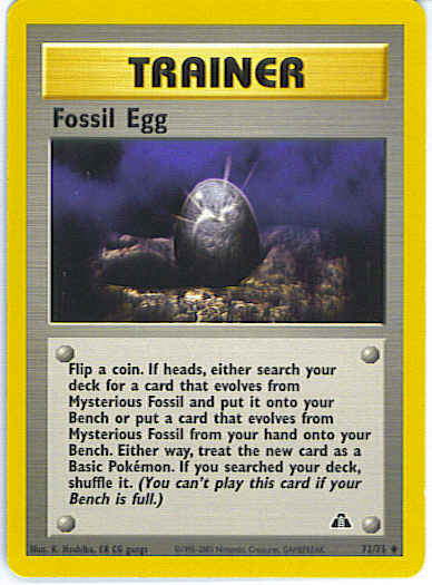 Flip a coin. If heads, either search your deck for a card that evolves from Mysterious Fossil and put it on your Bench or put a card that evolves from Mysterious Fossil from your hand onto your Bench. Either way, treat the new card as a Basic Pokemon. If you searched your deck, shuffle it. (You can't play this card if your Bench is full.)