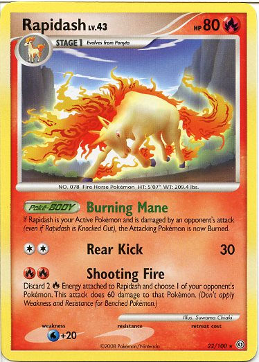 | Type | Fire | | Pokemon serie | Stormfront | | Stadie | Stage 1 | | HP | 80.0 | | Sjældenhed | Rare | | Tilbagetrækning | 0.0 | | Svaghed | W+20 | | Kortnummer | 22 | | Evne |