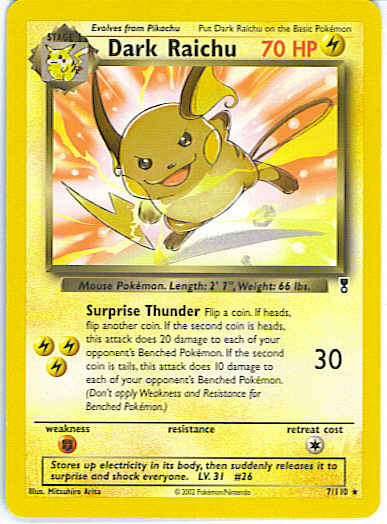 Evne [LLL] Surprise Thunder (30) Flip a coin. If heads, flip another coin. If the second coin is heads, this attack does 20 damage to each of your opponent's Benched Pokemon. If the second coin is tails, this attack does 10 damage to each of your opponent's Benched Pokemon. (Don't apply Weakness and Resistance for Benched Pokemon