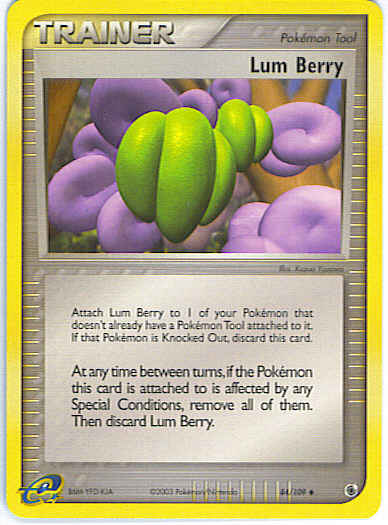 EvneAt any time between turns, if the Pokemon this card is attached to is affected by any Special Conditions, remove all of them. Then discard Lum Berry.