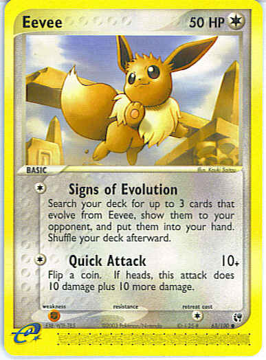 | Type | Colorless | | Pokemon serie | Sandstorm | | Stadie | Basic | | HP | 50 | | Sjældenhed | Common | | Tilbagetrækning | 1 | | Svaghed | F | | Kortnummer | 63 | | Evne | [C] Signs of Evolution - Search your deck for up to 3 cards that evolve from Eevee, Show them to your opponent, and put them into your Hand. Shuffle your deck afterward. [C] Quick Attack (10+) Flip a coin. If heads, this attack does 10 damage plus 10 more damage.