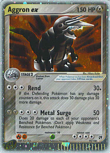 | Type | Metal | | Pokemon serie | Sandstorm | | Stadie | Stage 2 | | HP | 150 | | Sjældenhed | Ultra-Rare | | Tilbagetrækning | 4 | | Modstand | G | | Svaghed | FR | | Kortnummer | 95 | | Evne | [CCC] Rend (30+) If the Defending Pokemon has any damage counters on it, this attack does 30 damage plus 30 more damage. [CCCMM] Metal Surge (50) Does 20 damage to each of your opponent's Benched Pokemon. (Don't apply Weakness and Resistance for Benched Pokemon.)
