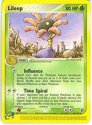| | Evne2 | [C] Influence - Search your deck for Omanyte, Kabuto, Aerodactyl, Lileep, or Anorith and put up to 2 of them onto your Bench. Shuffle your deck afterward. Treat the new Benched Pokemon as a Basic Pokemon. [CC] Time Spiral - If your opponent has any Evolved Pokemon in play, choose 1 of them and flip a coin. If Heads, remove the highest Stage Evolution card on that Pokemon and have your opponent shuffle it into his or her deck.