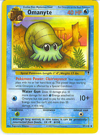 Evne [W] Water Gun (10+) Does 10 damage plus 10 more damage for each W Energy attached to Omanyte but not used to pay for this attack's Energy cost. You can't add more than 20 damage in this way.