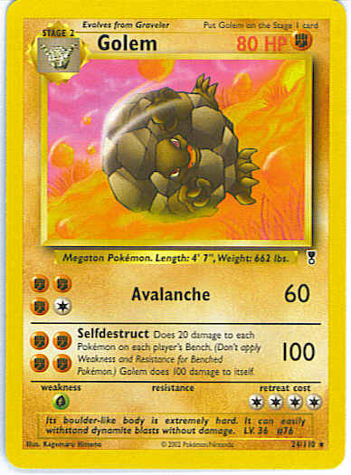 [FFFF] Selfdestruct (100) Does 20 damage to each Pokemon on each player's Bench. (Don't apply Weakness and Resistance for Benched Pokemon.) Golem does 100 damage to itself.