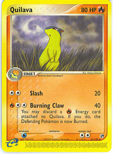 [CCR] Burning Claw (40) You may discard a R Energy card attached to Quilava. If you do the Defending Pokemon is now Burned.
