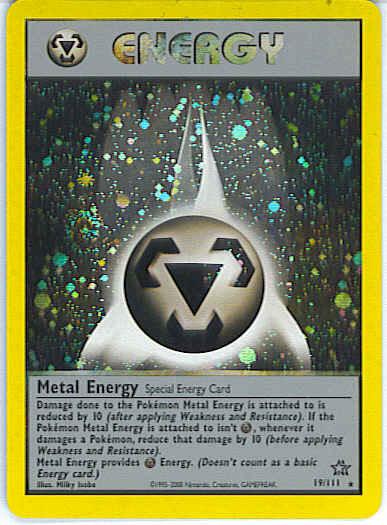 Evne Damage done to Pokemon Metal Energy is attached to is reduced by 10 (after applying Weakness and Resistance). If the Pokemon Metal Energy is attached to isn't Steel, whenever it damages a Pokemon, reduce that damage by 10 (before applying Weakness and Resistance). Metal Energy provides M Energy. (Doesn't count as a basic Energy card.)
