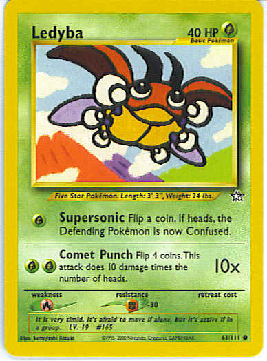 | Type | Grass | | Pokemon serie | Neo Genesis | | Stadie | Basic | | HP | 40 | | Sjældenhed | Common | | Modstand | F | | Svaghed | R | | Kortnummer | 63 | | Evne |