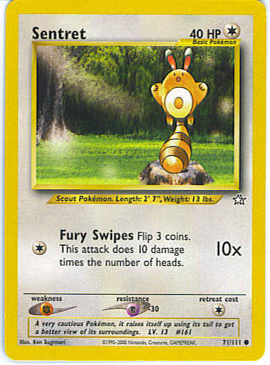 | Type | Colorless | | Pokemon serie | Neo Genesis | | Stadie | Basic | | HP | 40 | | Sjældenhed | Common | | Tilbagetrækning | 1 | | Modstand | P | | Svaghed | F | | Kortnummer | 71 | | Evne |