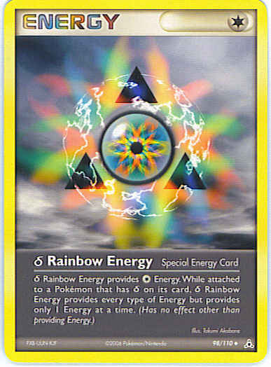 Evne2 Delta Species Rainbow Energy provides C Energy. While attached to a Pokemon that has Delta Species on its card, Delta Species Rainbow Energy provides every type of Energy but provides only 1 Energy at a time. (Has no effect other than providing Energy.)