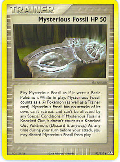 Play Mysterious Fossil as if it were a Basic Pokemon. While in play, Mysterious Fossil counts as a C Pokemon (as well as a Trainer card). Mysterious Fossil has no attacks, can't retreat, and can't be Asleep, Confused, Paralyzed, or Poisoned. If Mysterious