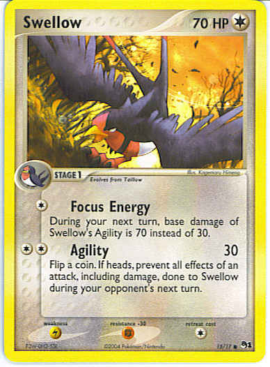 | Type | Colorless | | Pokemon serie | OP Series 1 | | Stadie | Stage 1 | | HP | 70 | | Sjældenhed | Common | | Tilbagetrækning | 2 | | Modstand | F | | Svaghed | L | | Kortnummer | 15 | | Evne | [C] Focus Energy - During your next turn, base damage of Swellow's Agility is 70 instead of 30. [CC] Agility (30) Flip a coin. If heads, prevent all effects of an attack, including damage, done to Swellow during your opponent's next turn.